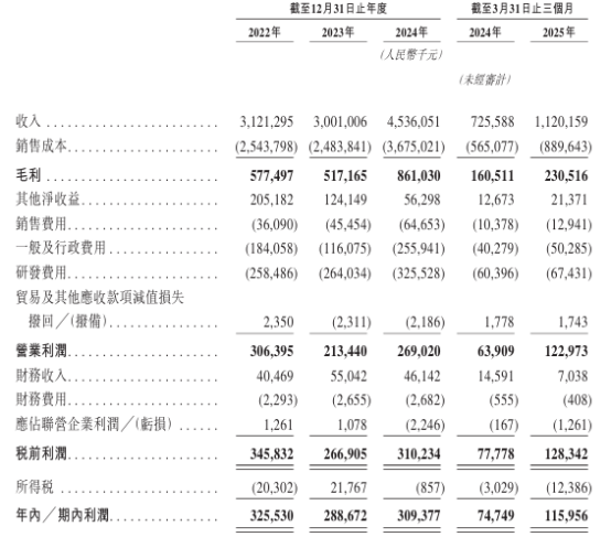 于2022-2024年度(截至各年度12月31日止),及2025年前3个月(截至3月31日止),公司收入分别为31.21亿、30.01亿、45.36亿和11.20亿元人民币;对应同期,期内利润分别为3.26亿、2.89亿、3.09亿和1.16亿元人民币。