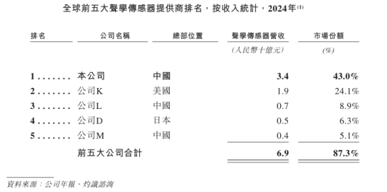 2024年,全球声学传感器市场规模达79亿元人民币。其中,按营收计,公司声学传感器位居全球第一,市场份额约43.0%。
