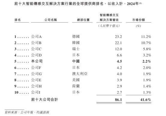 公司是一家覆盖传感器、SiP和传感交互模组的智能传感交互解决方案提供商,尤其专注于声学传感器。根据灼识谘询的资料,以2024年销售额计,公司是全球第五大智能传感交互解决方案提供商,市场份额为2.2%,而全球最大的智能传感交互解决方案提供商市场份额为11.2%,公司亦是中国第一大智能传感交互解决方案提供商。