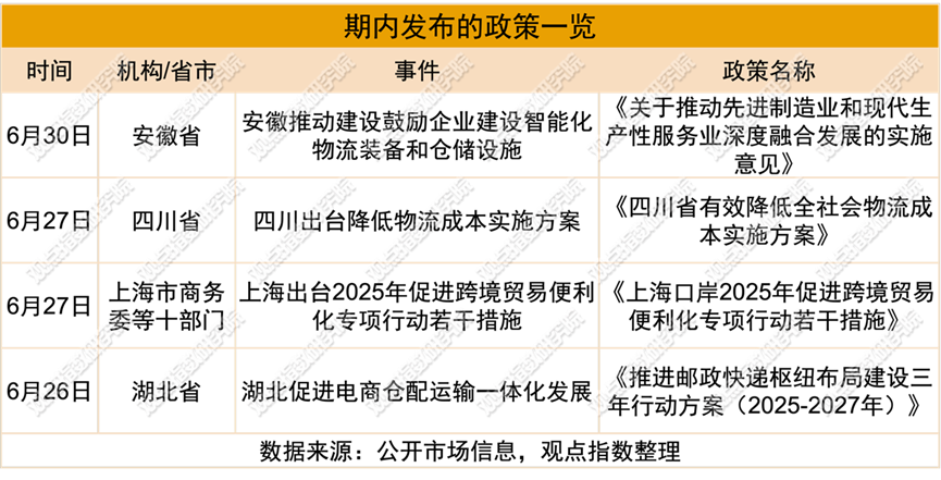 政策方面,据观点指数不完全统计,共录得四起政策,其中一起提出推动社会物流成本的降低,另外三起政策表示要推动跨境电商产品出海。