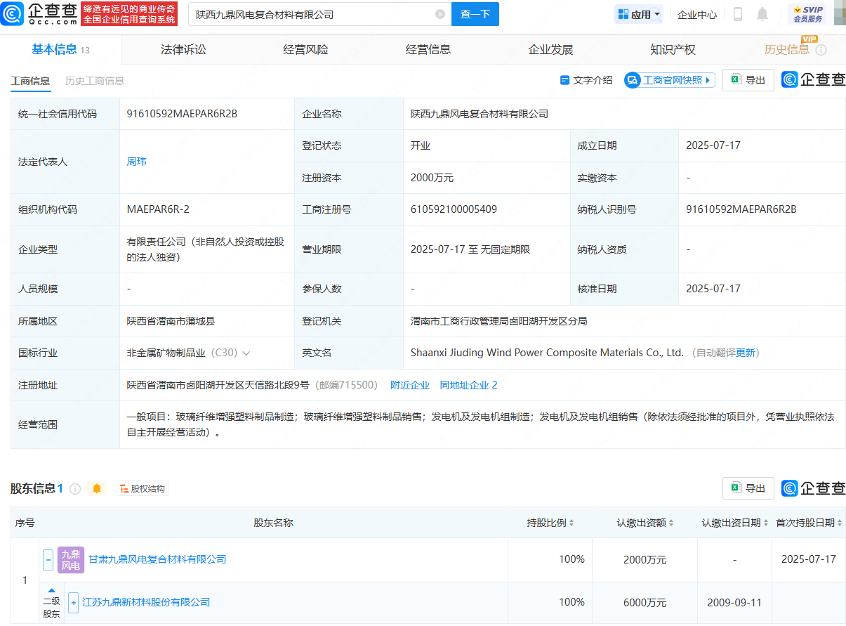 企查查APP显示,近日,陕西九鼎风电复合材料有限公司成立,法定代表人为周玮,注册资本为2000万元,经营范围包含:玻璃纤维增强塑料制品制造;玻璃纤维增强塑料制品销售;发电机及发电机组制造等。企查查股权穿透显示,该公司由九鼎新材(002201)间接全资持股。