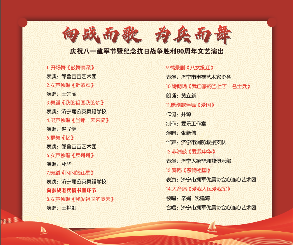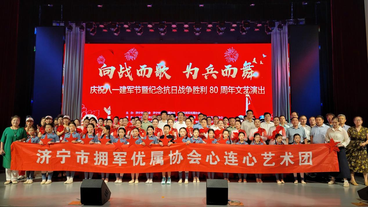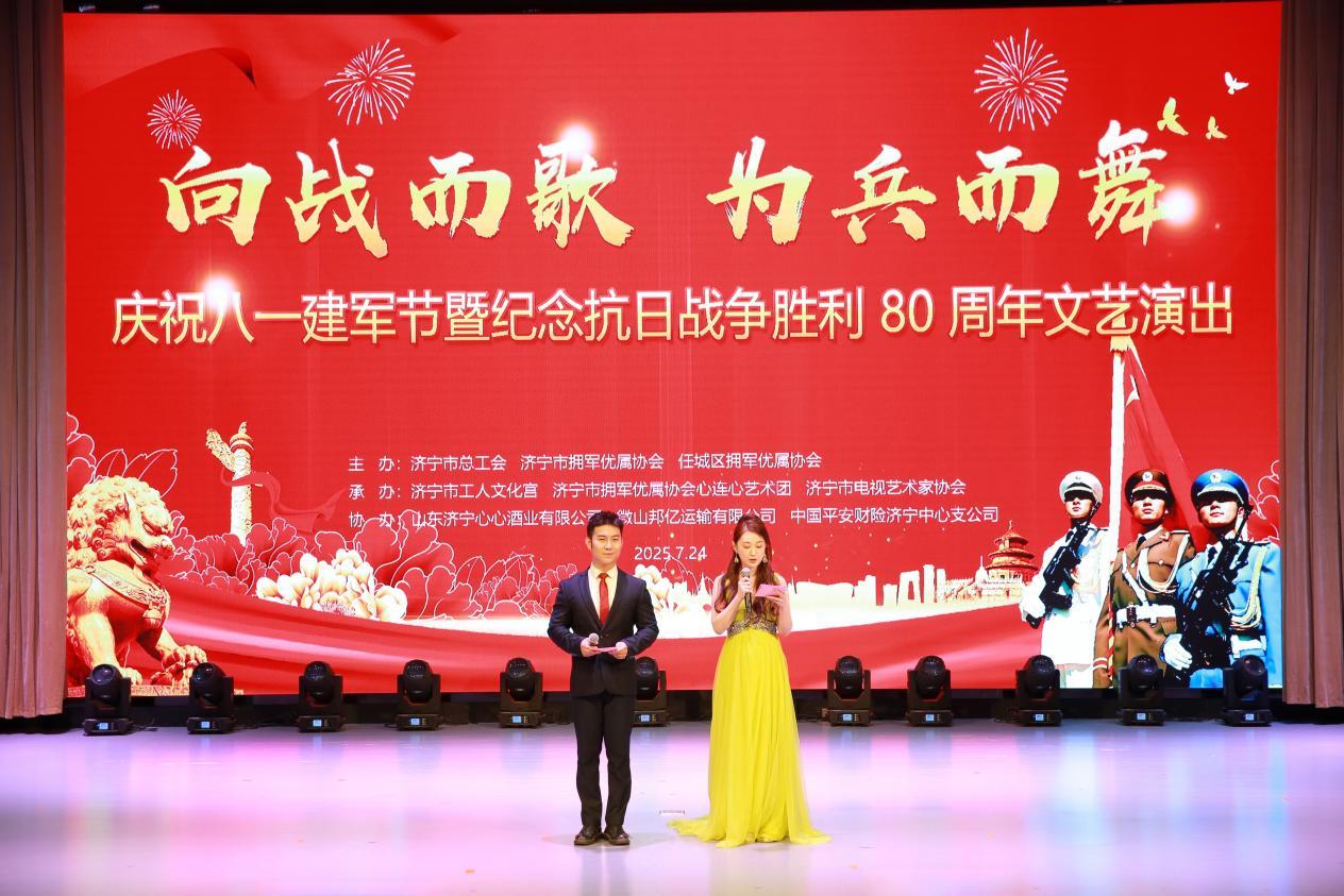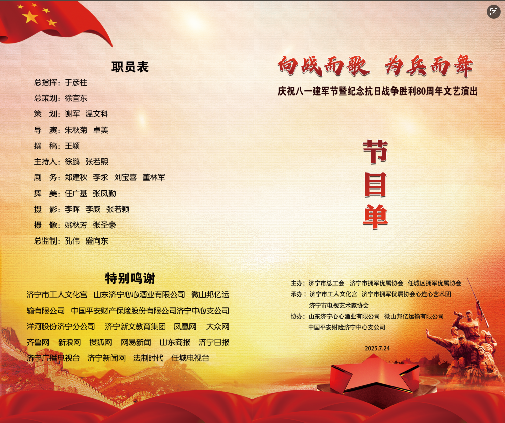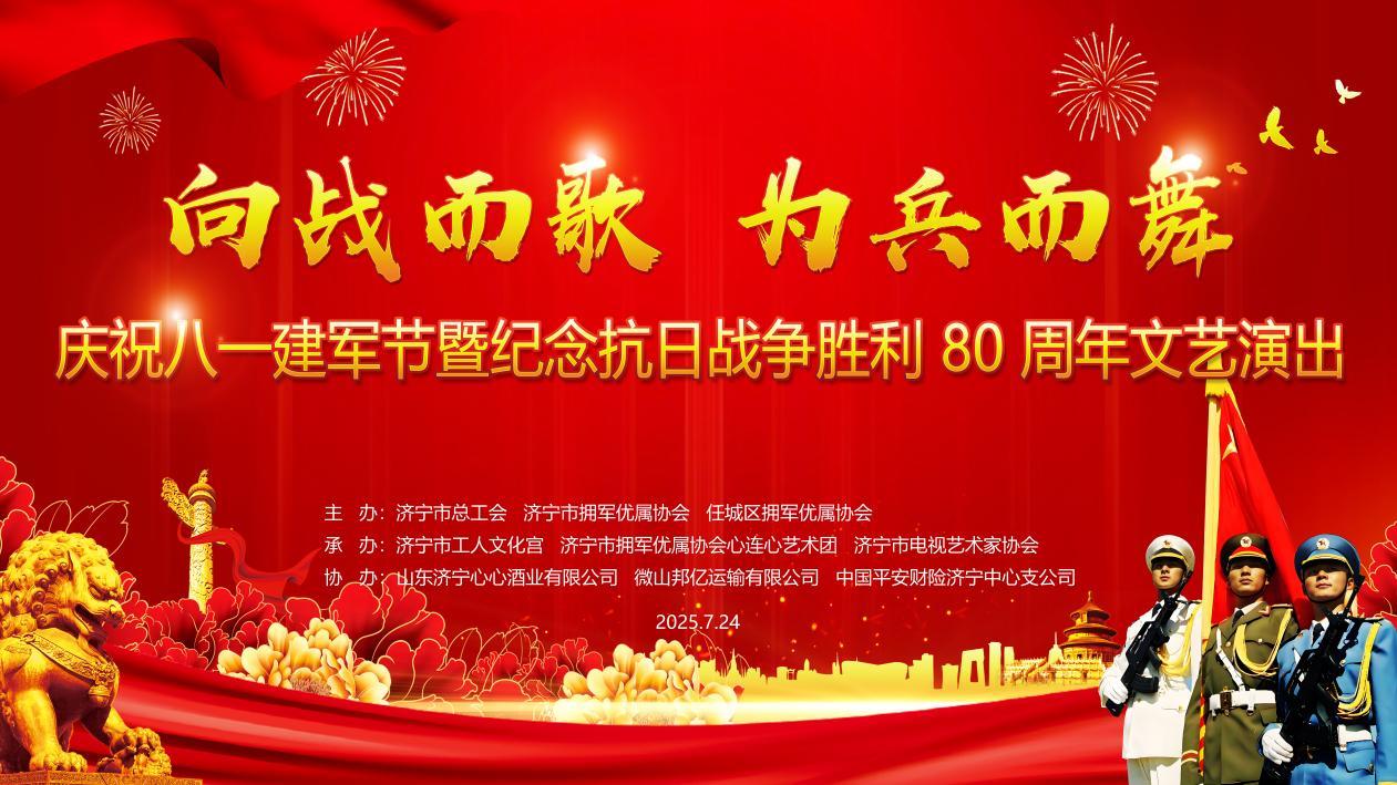 向战而歌 为兵而舞—济宁市庆祝八一建军节暨纪念抗日战争胜利80周年文艺演出,由济宁市总工会、济宁市拥军优属协会、任城区拥军优属协会主办。济宁市工人文化宫、济宁市拥军优属协会心连心艺术团、济宁市电视艺术家协会承办。山东济宁心心酒业有限公司、微山邦亿运输有限公司、中国平安财险济宁中心支公司协办。