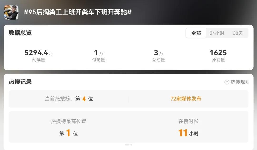 在网上看到一个热搜——#95后掏粪工上班开粪车下班开奔驰