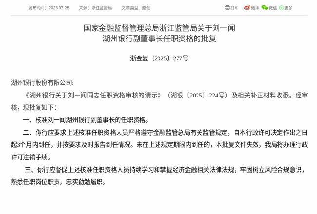 2025年7月25日,根据国家金融监督管理总局消息,《湖州银行关于刘一闻同志任职资格审核的请示》获得通过,批复刘一闻湖州银行股份有限公司副董事长的任职资格。