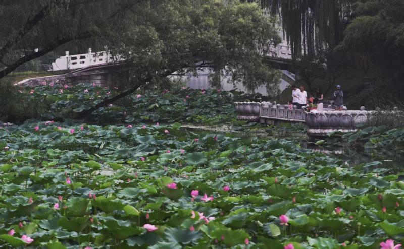 据悉,紫竹院公园的荷花渡景区是赏荷宝地,荷花种植面积约30亩,有特色品种白洋淀红莲、白莲、舞妃莲、大洒锦等。市民游客登上摇橹船,在800米长的航道内缓缓前行,可近距离欣赏沿途碧绿丛中盛开的各色荷花,看鸳鸯、赤麻鸭在湖中嬉戏玩耍,尽情享受惬意时光。