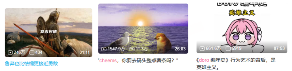 例如《明日方舟》UP主@发誓不做夜猫子 随手放出的1400万播放量的《我的出租屋里真的有很多蟑螂,但我认识的粥批真的没有几个》,例如@亚细亚旷世奇才的一首2800万播放量的出道曲《莫愁乡》,甚至包括在今年4月突然翻红的NIKKE角色二创形象“DORO”的诸多“坏结局”。