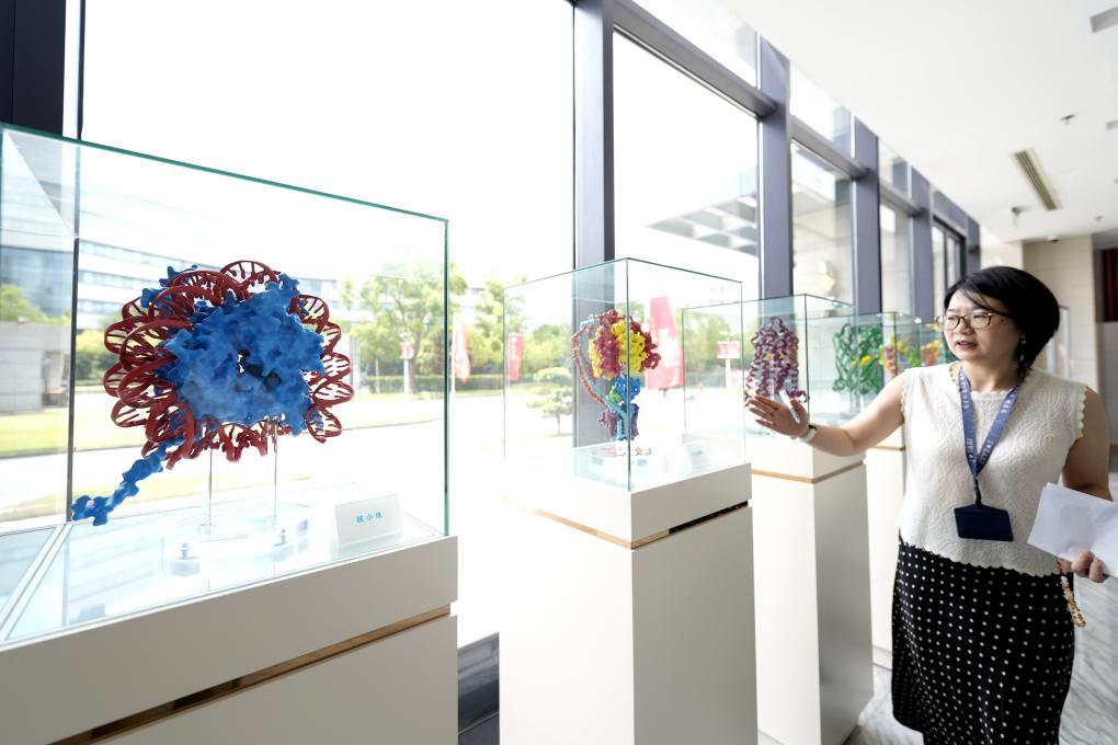 7月25日,国家蛋白质科学研究(上海)设施工作人员介绍展示的蛋白质结构模型。新华社记者 张建松 摄