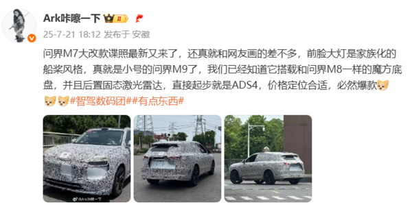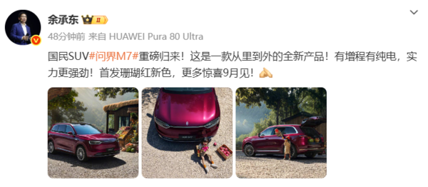 7月28日,华为常务董事、终端BG董事长余承东在社交平台上发文称,国民SUV问界M7将是一款从里到外的全新产品,首发珊瑚红新配色,有增程和纯电双版本,预计将于2025年9月正式上市。