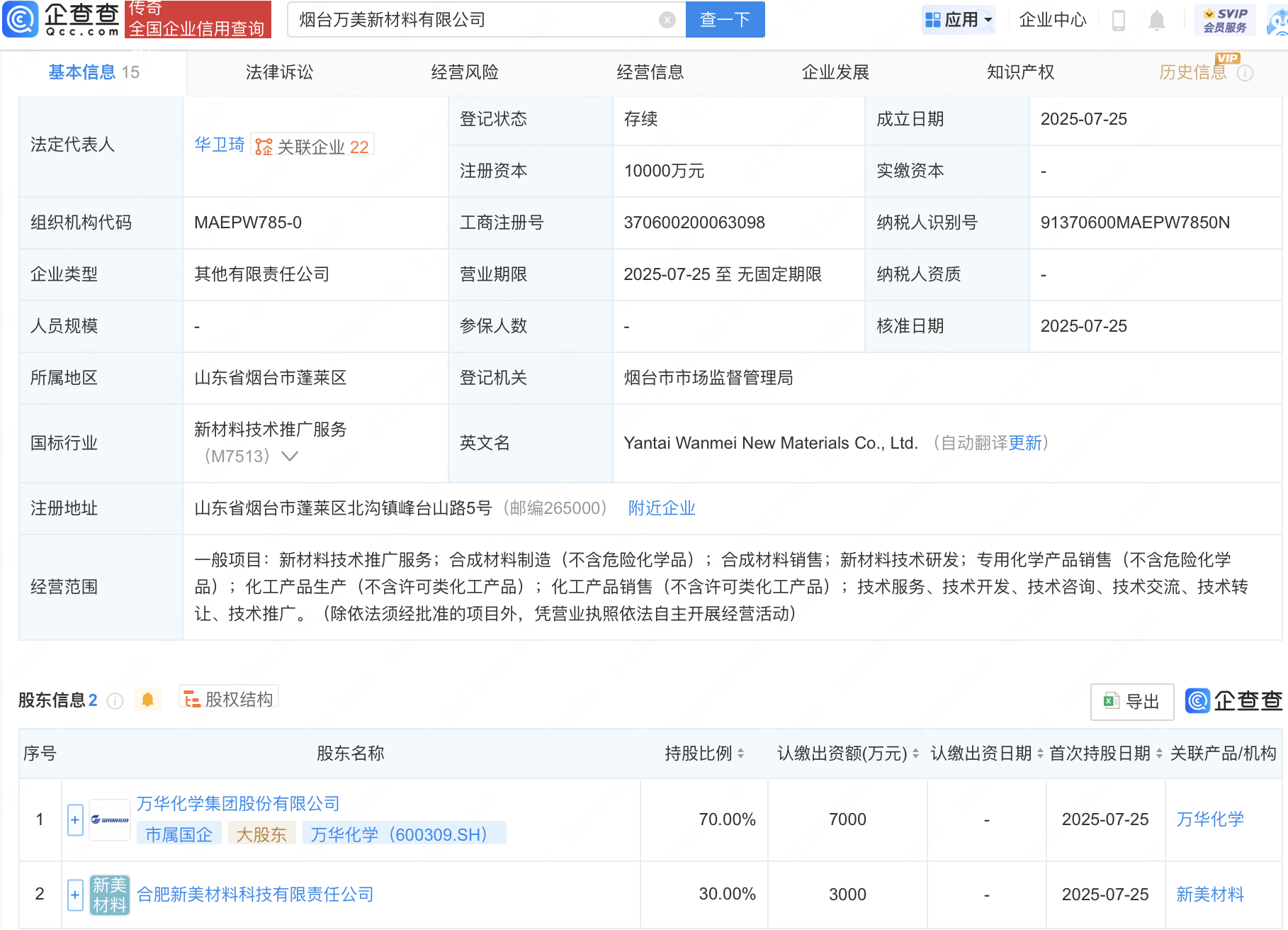 企查查APP显示,近日,烟台万美新材料有限公司成立,注册资本1亿元,经营范围包含:合成材料销售;新材料技术研发;专用化学产品销售(不含危险化学品)等。企查查股权穿透显示,该公司由万华化学(600309)等共同持股。