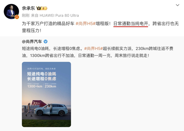 今日,尚界观点揭晓了尚界H5的更多亮点配置,新车增程版CLTC纯电续航达到230km,基本可以满足用户日常通勤一周需求,余承东也发文表示日常通勤可以当作纯电车开,为其综合产品力再添一块长版,配合超1300km满油满电超长续航,真正实现了全场景用车无忧。