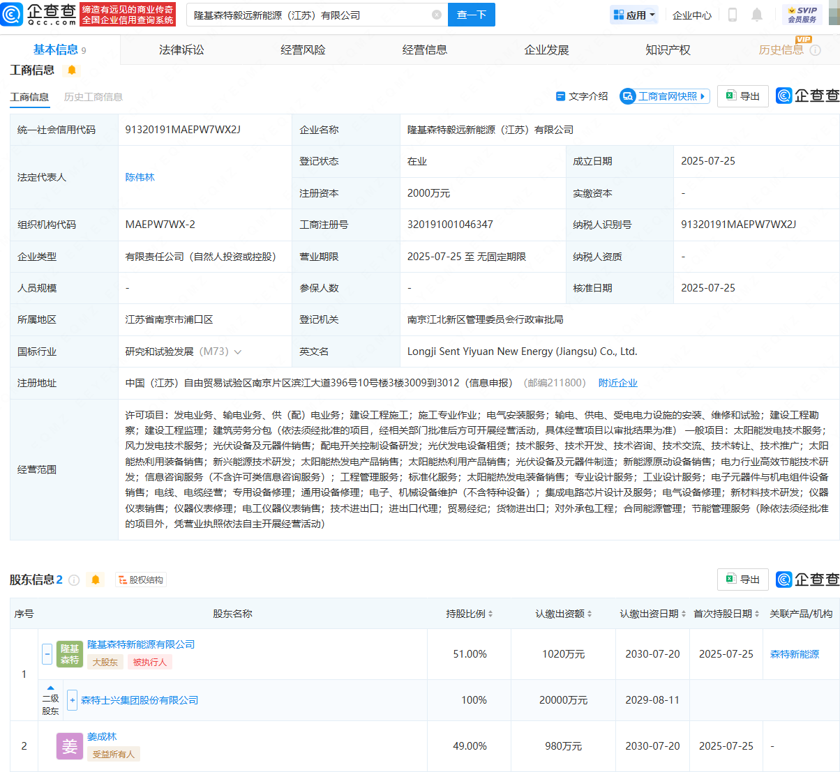 企查查APP显示,近日,隆基森特毅远新能源(江苏)有限公司成立,法定代表人为陈伟林,注册资本为2000万元,经营范围包含:发电业务、输电业务、供(配)电业务;建设工程施工;太阳能发电技术服务;贸易经纪等。企查查股权穿透显示,该公司由森特股份(603098)旗下隆基森特新能源有限公司、姜成林共同持股。
