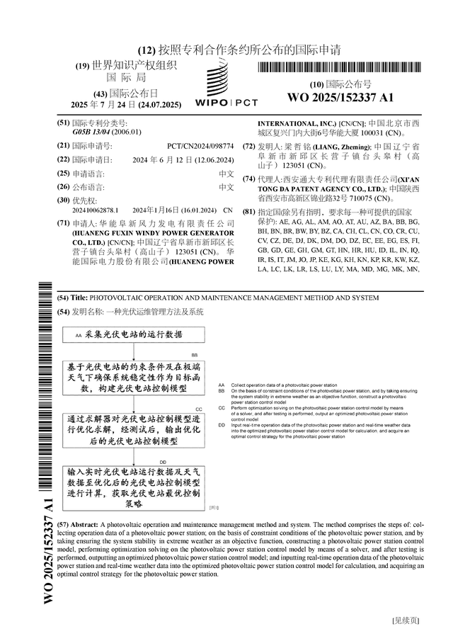 证券之星消息,根据企查查数据显示华能国际(600011)公布了一项国际专利申请,专利名为“一种光伏运维管理方法及系统”,专利申请号为PCT/CN2024/098774,国际公布日为2025年7月24日。