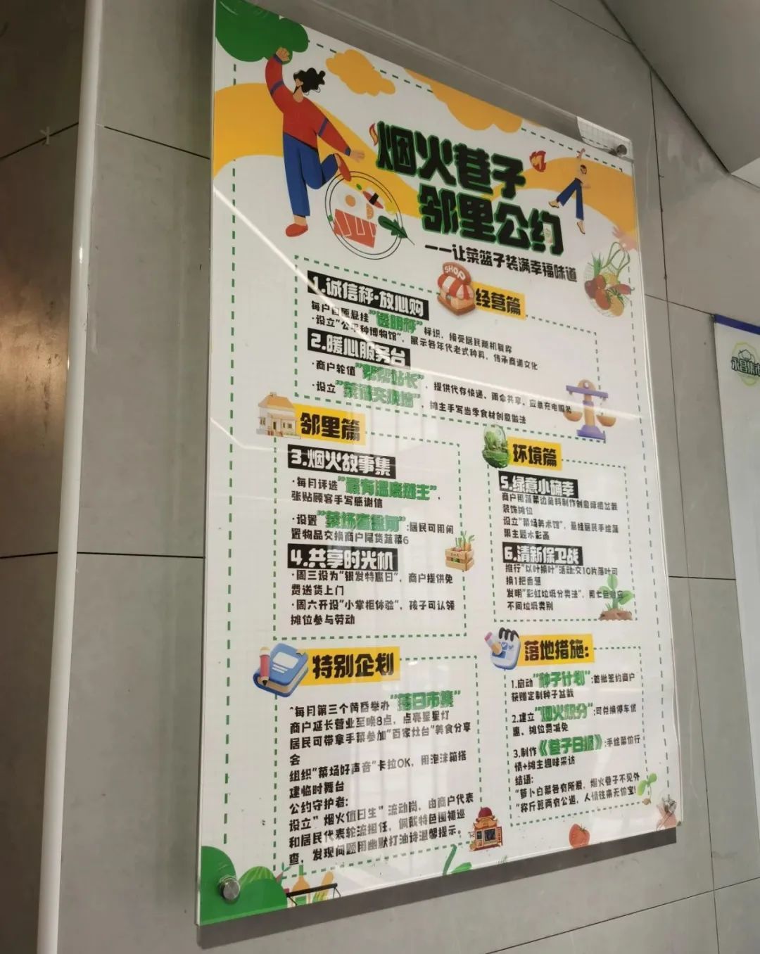 赵亮:“我们一直在思考,怎么样让菜场和小区能够共融,能够大家相互支撑、相互喜欢、相互接受。在大量的调研之后,商户和居民共同制定产生了这个'邻里公约'。