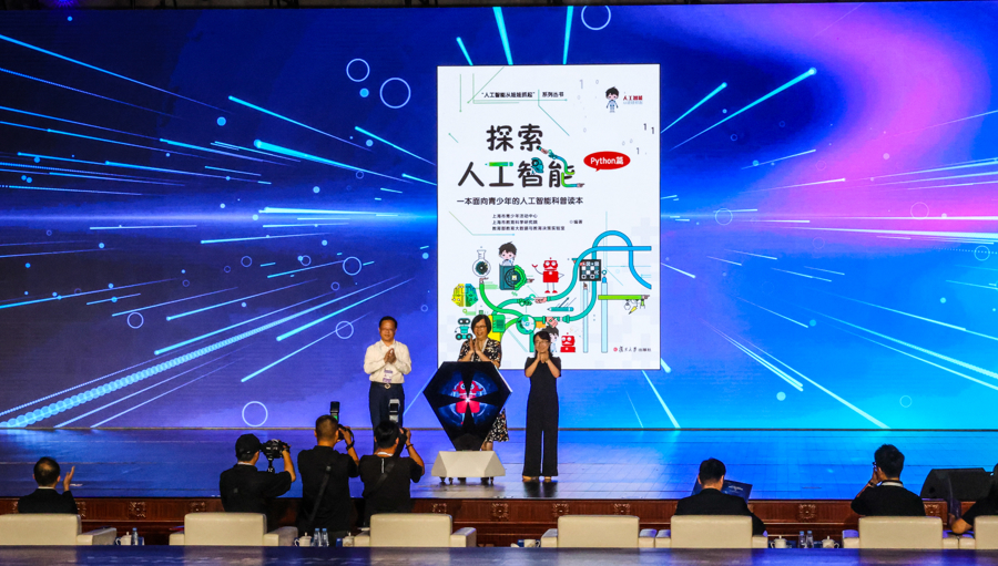 论坛上举行了“人工智能从娃娃抓起”系列科普丛书第三册——《探索人工智能(Python篇)》新书发布仪式。上海师范大学校长袁雯、共青团上海市委副书记杨杨、上海市教育科学研究院院长桑标共同启动发布。