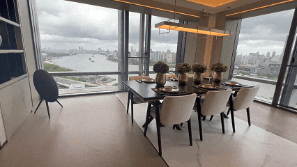 另一个无窗框的“隐形美学”的突破性呈现,摒弃传统窗框+窗扇组合,采用全上海罕见的平推窗设计,从室内几乎看不到窗的存在。保利是在对比6种开窗方式后选定的外平推设计,既保证了最大通风量,又让立面线条更简洁。