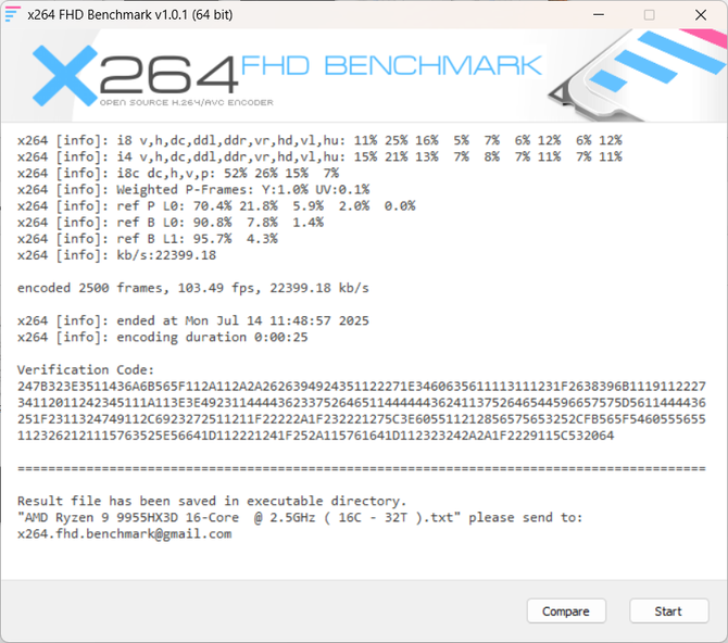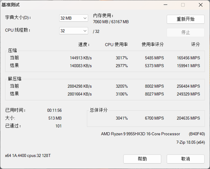 在7-Zip性能测试中,锐龙9 9955HX3D也获得了压缩159941MIPS,解压249329MIPS的成绩,保持了AMD在解压缩方面的一贯优势。
