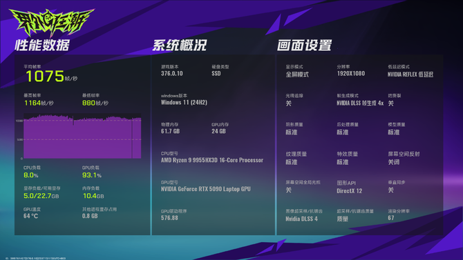 同样的,在界外狂潮中,我们将分辨率下调至1080P,平均帧数直接爆涨到了977帧,最高帧直接突破1000帧,来到了1075帧,最低帧也有880帧,轻松实现千帧电竞的梦想;