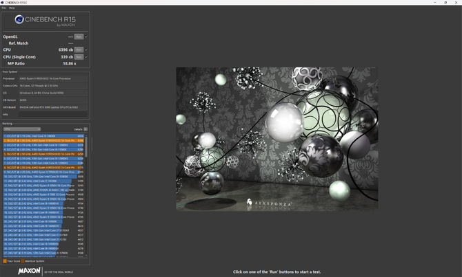 先来看理论成绩。进行Cinebench测试,在R15中,这颗锐龙9 9955HX3D获得了单核339分、多核6396分的成绩;