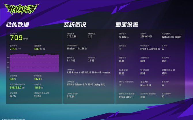 《界外狂潮》中,我们开启DLSS 4质量档与4倍帧生成。最终,《界外狂潮》跑出了平均709帧的成绩,最低帧也有足足637帧,实现了无限接近《CS2》的成绩。