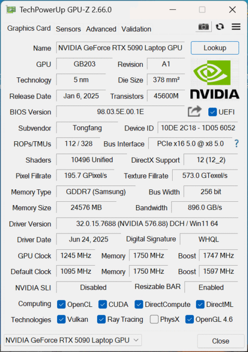 NVIDIA GeForce RTX 5090 Laptop显卡则是NVIDIA在移动端的当家旗舰,同样采用台积电4nm工艺打造,拥有10496个CUDA核心与24GB GDDR7显存,AI算力高达1824 TOPS。同时,其也支持全新的DLSS 4,4倍帧生成、全新Transformer模型、Reflex 2技术一应俱全。