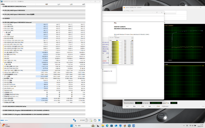 首先是这颗搭载了3D V-Cache的锐龙9 9955HX3D。单烤FPU,处理器功耗130W,两颗CCD频率都稳定在3.7GHz,CCD1温度稳定在87.5摄氏度,CCD2稳定在88.2℃。可以看出,虽然也是额外堆积了L3缓存,但在第二代3D V-Cache技术的加持下,温度相对老款X3D处理器有了十足的进步。