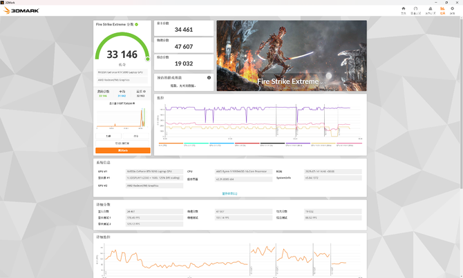 Fire Strike Extreme中,则是显卡34461分、处理器47607分,综合33146分的成绩;