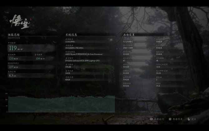 压力更大的《黑神话:悟空》中,我们开启2倍帧生成与DLSS 质量档,在影视级预设下,苍龙16 Ultra仍然跑出了平均119帧的超高帧率,95%的帧率均高于107帧,表现稳定得可怕。