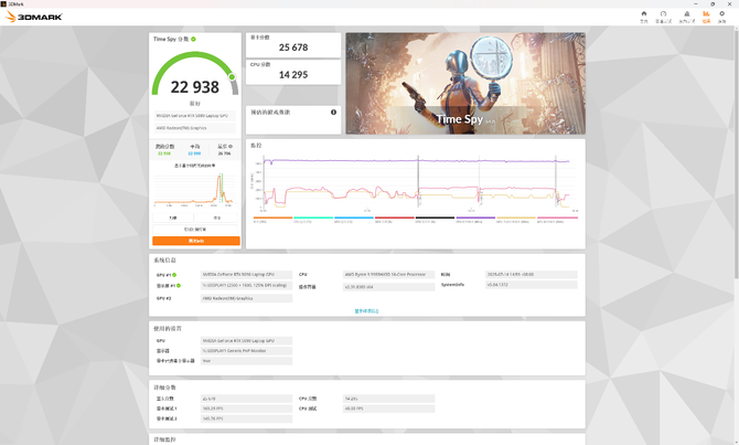 同时,我们也进行了3DMark跑分测试。在Time Spy项目中,苍龙16 Ultra取得了显卡25678分、处理器14295分,综合22938分的成绩;