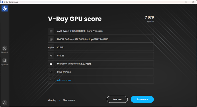 V Ray中,我们分别测试了仅使用处理器的V-Ray测试,综合显卡与处理器的V-Ray RTX与仅使用显卡的V-Ray CUDA。纯处理器模式下,这台苍龙16 Ultra分数达到47971分,RTX模式下,分数达到8460分,CUDA模式下达到7679分,表现优异。