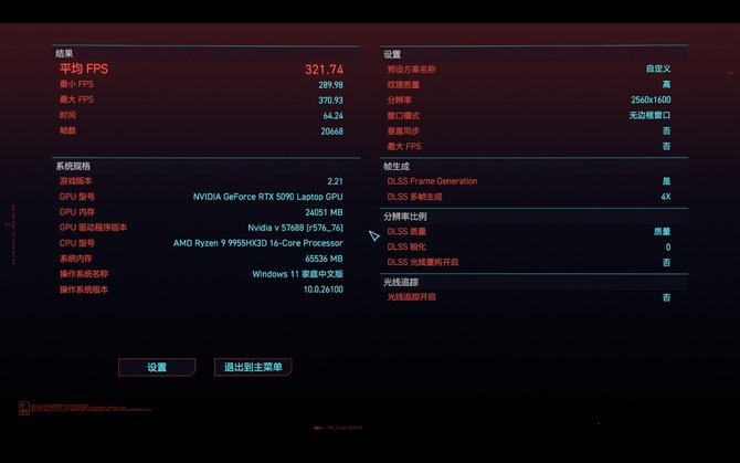 压力中等的《赛博朋克2077》中,开启4倍帧生成与DLSS 4质量档,这台性能野兽平均帧直接达到了321.74帧,用跑满这块300Hz电竞屏的帧率畅玩3A恐怕是以往完全不敢想象的。