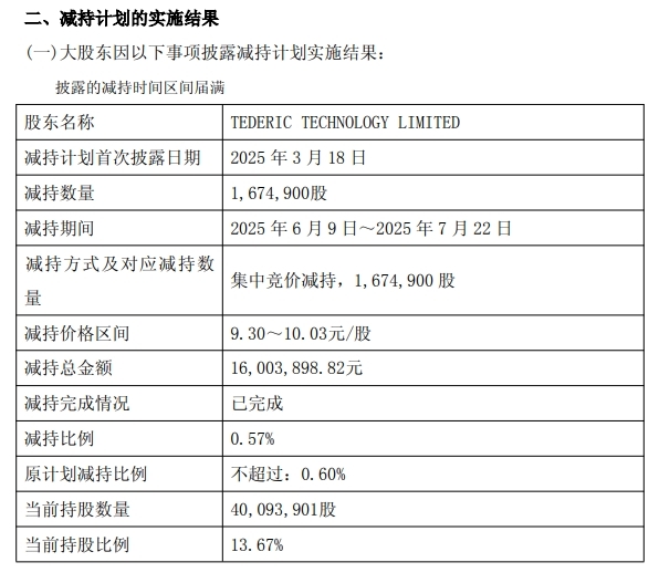 7月29日,泰瑞机器(603289)公告称,公司收到TEDERICBVI出具的《告知函》,截至7月27日,本次减持时间区间已届满。TEDERICBVI在减持期间内通过集中竞价方式累计减持公司股份1,674,900股,占公司总股本的0.57%。