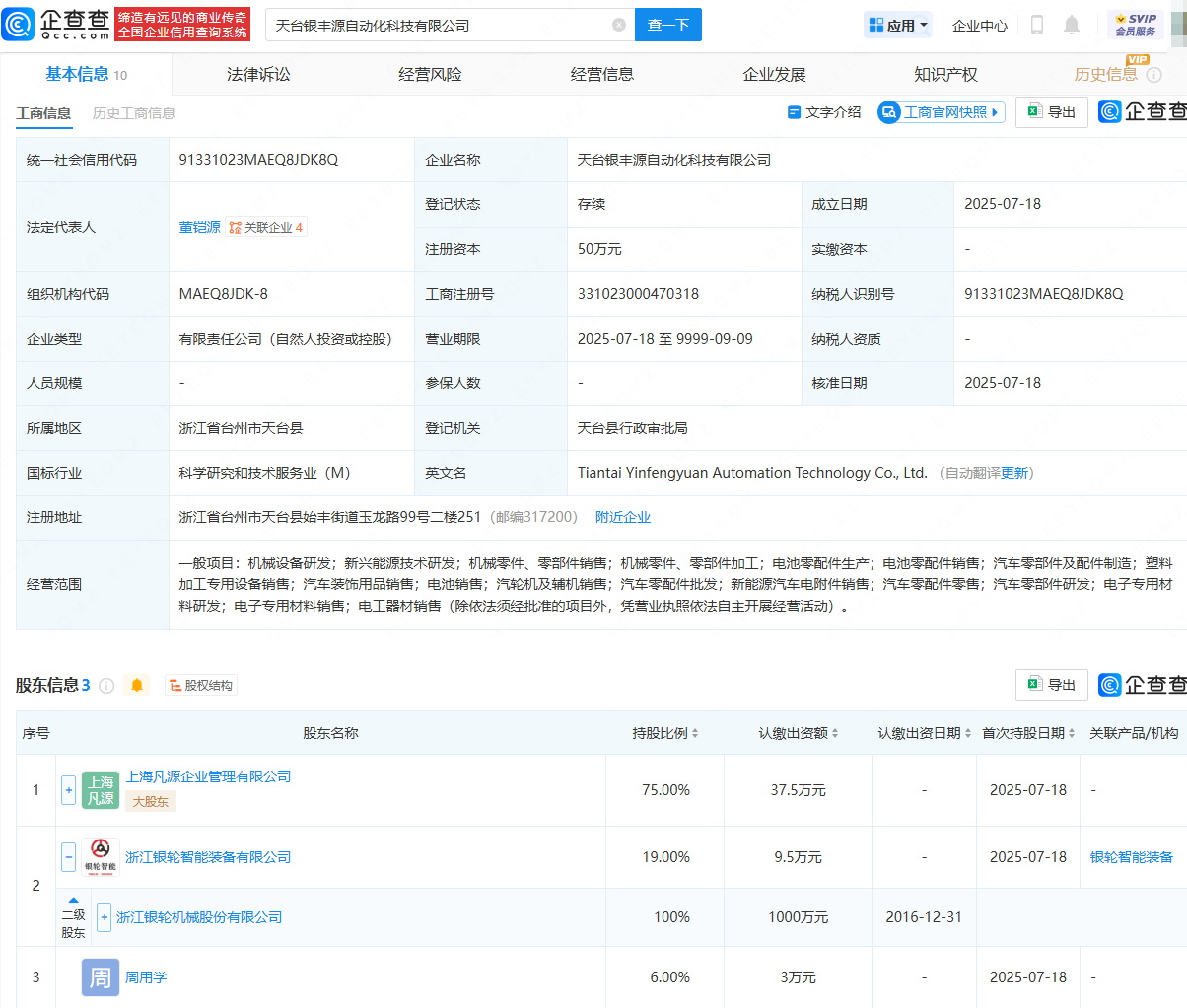 企查查APP显示,近日,天台银丰源自动化科技有限公司成立,法定代表人为董铠源,注册资本为50万元,经营范围包含:机械设备研发;新兴能源技术研发;电池零配件生产;电池零配件销售;汽车零部件及配件制造等。企查查股权穿透显示,该公司由上海凡源企业管理有限公司、银轮股份(002126)旗下浙江银轮智能装备有限公司等共同持股。