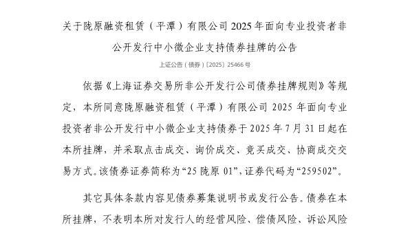 7月30日,上交所发布关于陇原融资租赁(平潭)有限公司2025年面向专业投资者非公开发行中小微企业支持债券挂牌的公告。
