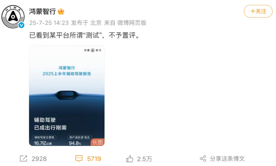 测试可信度和公平性,成了专家和车企们的争论焦点。参与测试的特斯拉创始人马斯克的海外转发和鸿蒙智行旗下品牌官方的“不予置评”态度,更是为其添了一把火,变成了全民关注的话题。