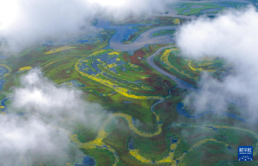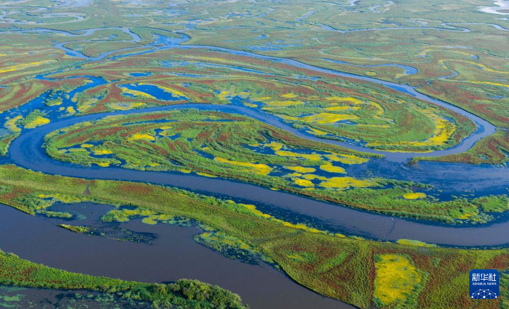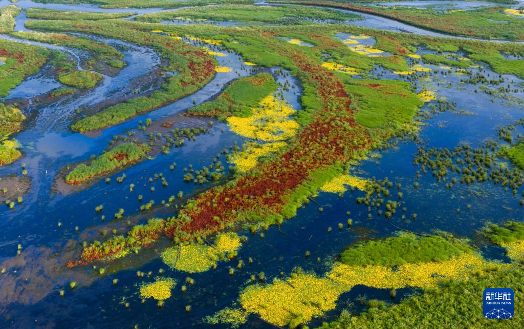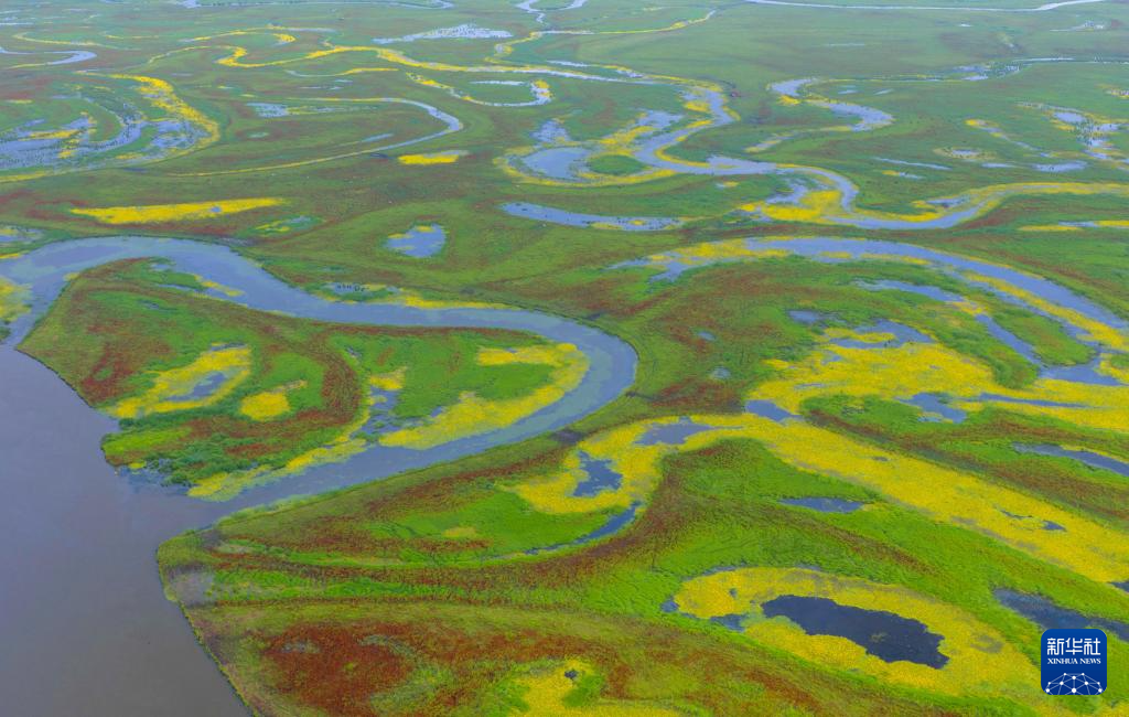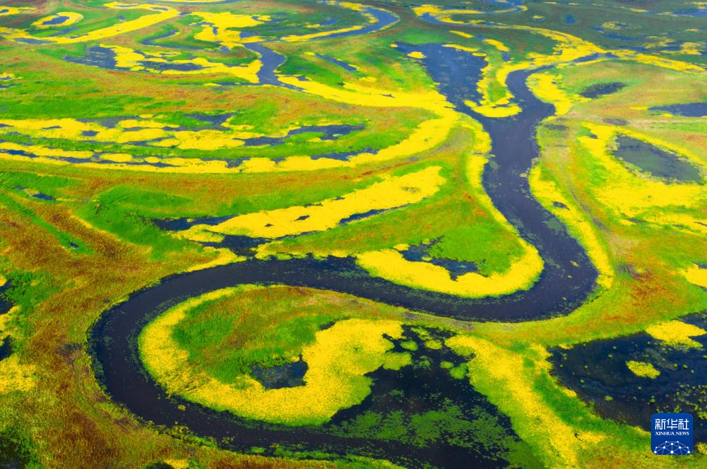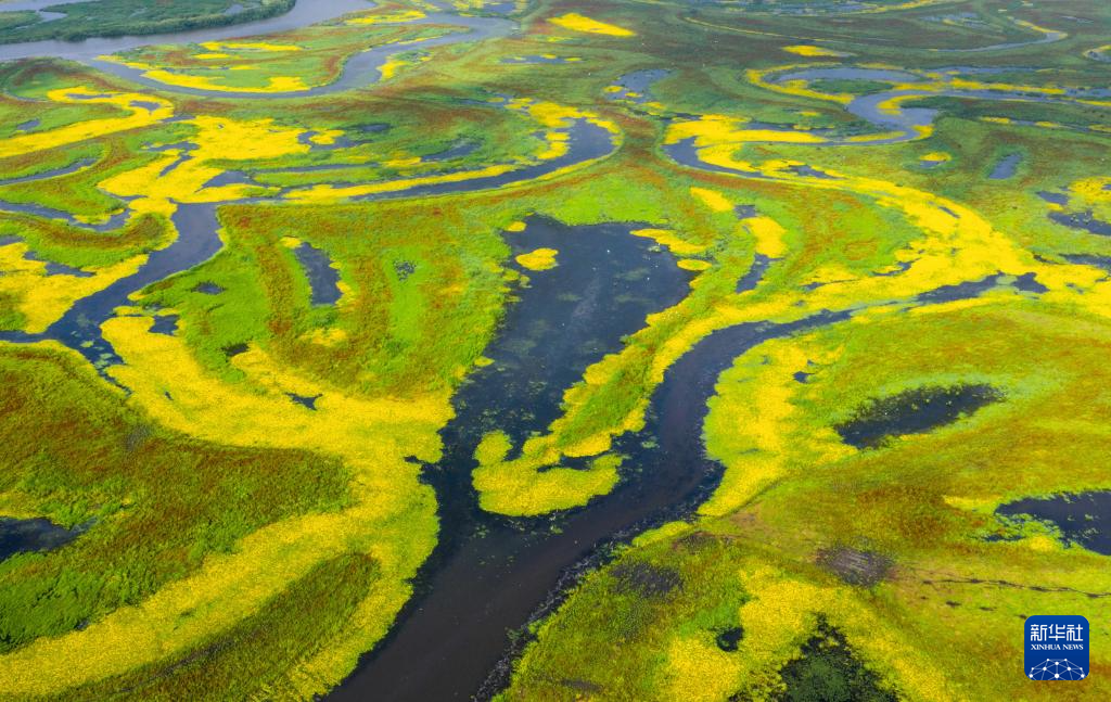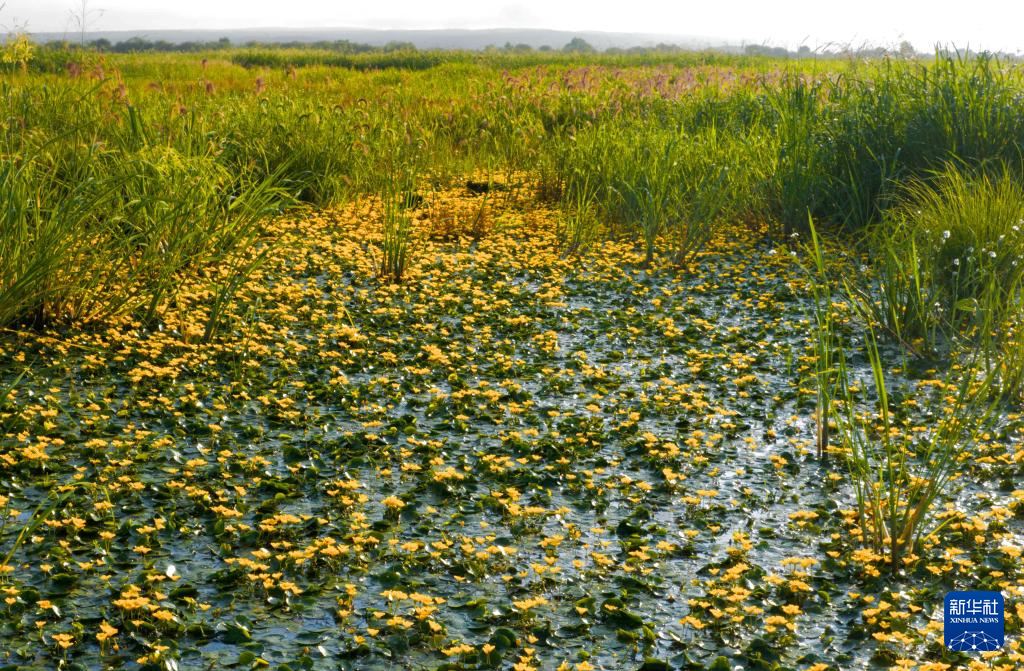 近日,黑龙江挠力河国家级自然保护区湿地中的驴蹄草盛开花朵,湿地仿佛披上了黄绿相间、色彩明艳的绸缎。