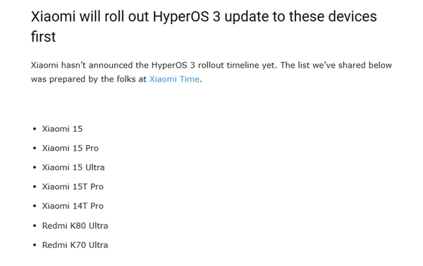 根据第三方信息源Xiaomi Time的整理,预计最先迎来HyperOS 3更新的设备包括:小米15、小米15 Pro、小米15 Ultra、小米15T Pro、小米14T Pro、Redmi K80 Ultra以及Redmi K70 Ultra。此外,即将发布的旗舰机型小米16、小米16 Pro、小米16 Pro Max预计将直接预装HyperOS 3系统上市。这一推送策略符合小米一贯的做法,即优先为最新旗舰机型提供重大系统更新,随后逐步覆盖其他高端及中端产品线,入门级设备则通常需要更长时间等待。