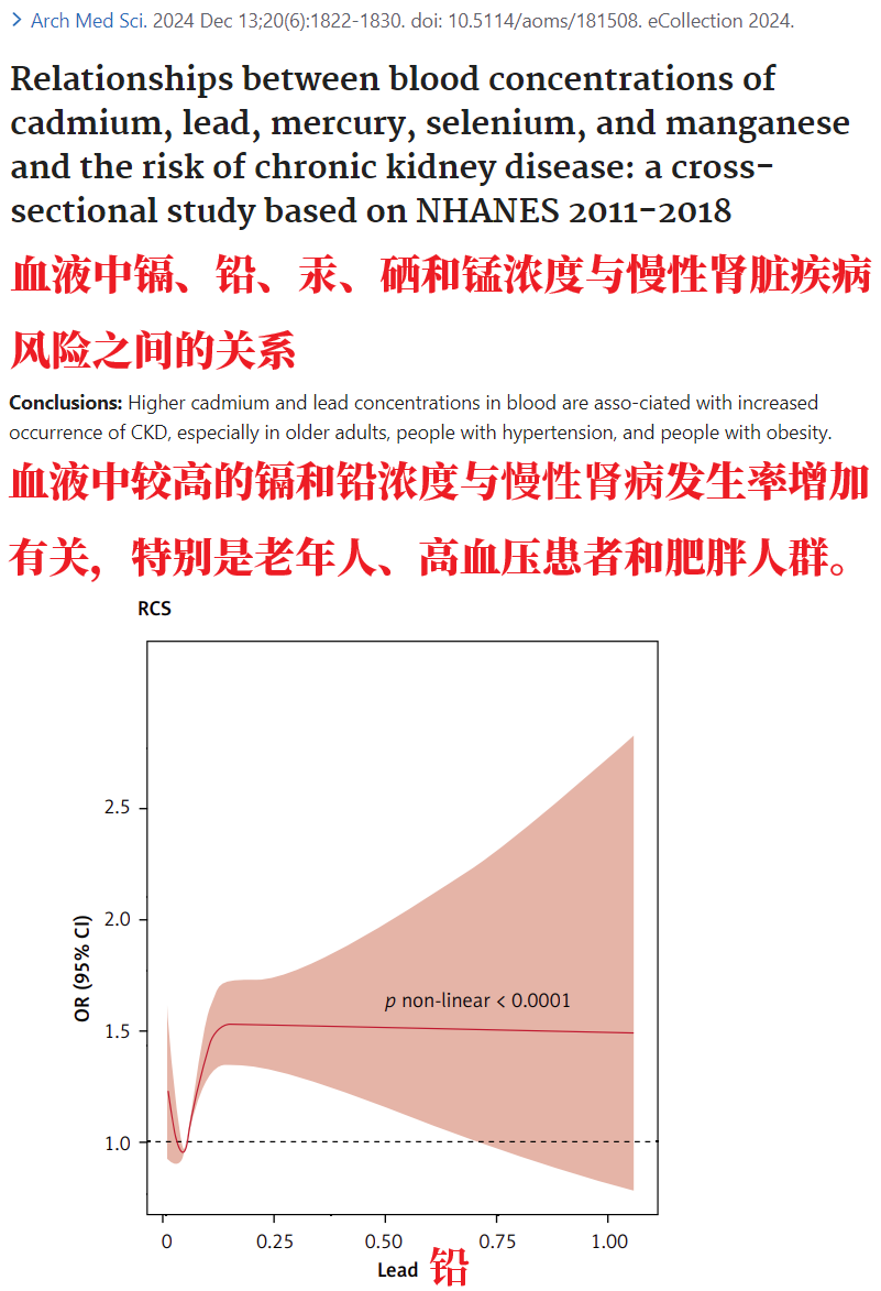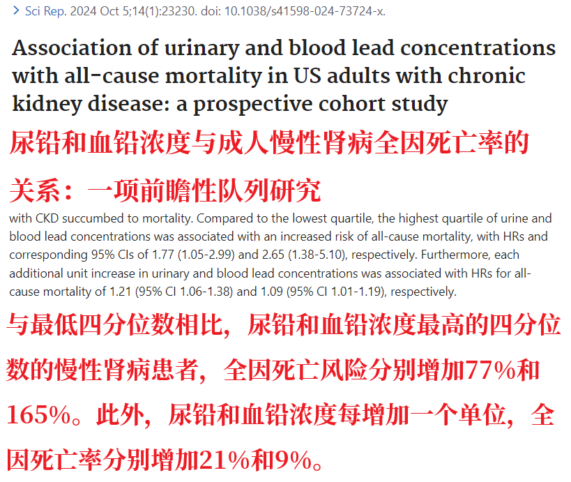 一项研究显示,相比于血铅水平11μg/L以内的人,成人血铅水平超过24μg/L的话,那么肾功能不全(肾小球滤过率低于60m/min/1.73㎡)的可能性要高出56%。