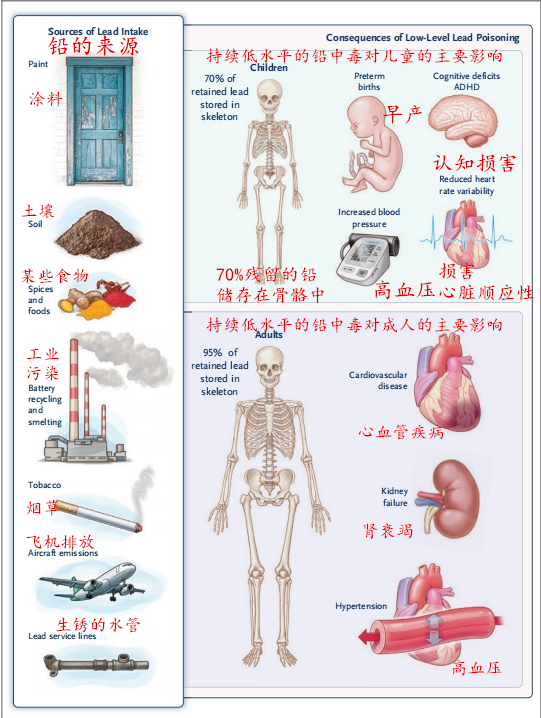 除了急性铅中毒症状,长期(即数年)持续血铅水平升高会对肾脏、心血管、认知功能和其他功能产生不可逆转的长期影响。