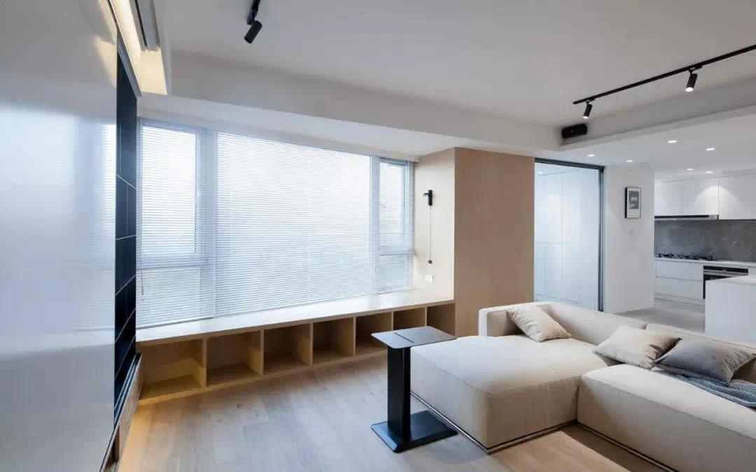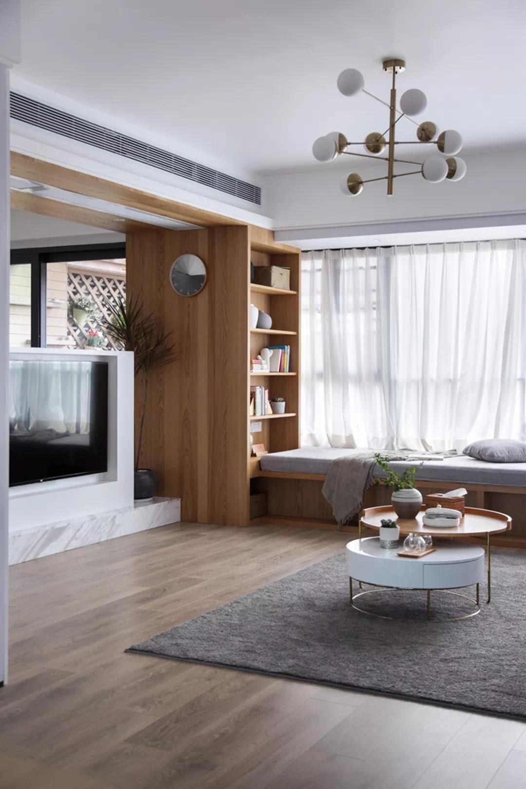 像下面客厅飘窗有些不规则,最好选择百叶窗帘,不仅好看,还让整个空间看起来更大气。