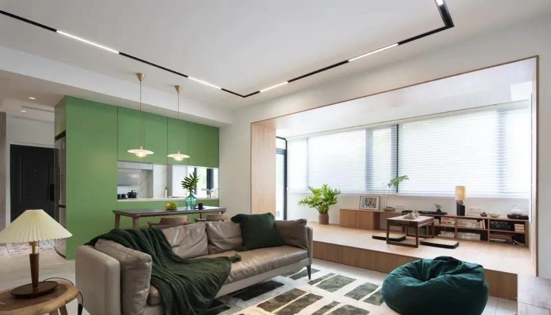 客厅窗户下的卡座占整面墙,就不要用落地窗帘,用卷帘或者百叶窗效果都棒棒哒。