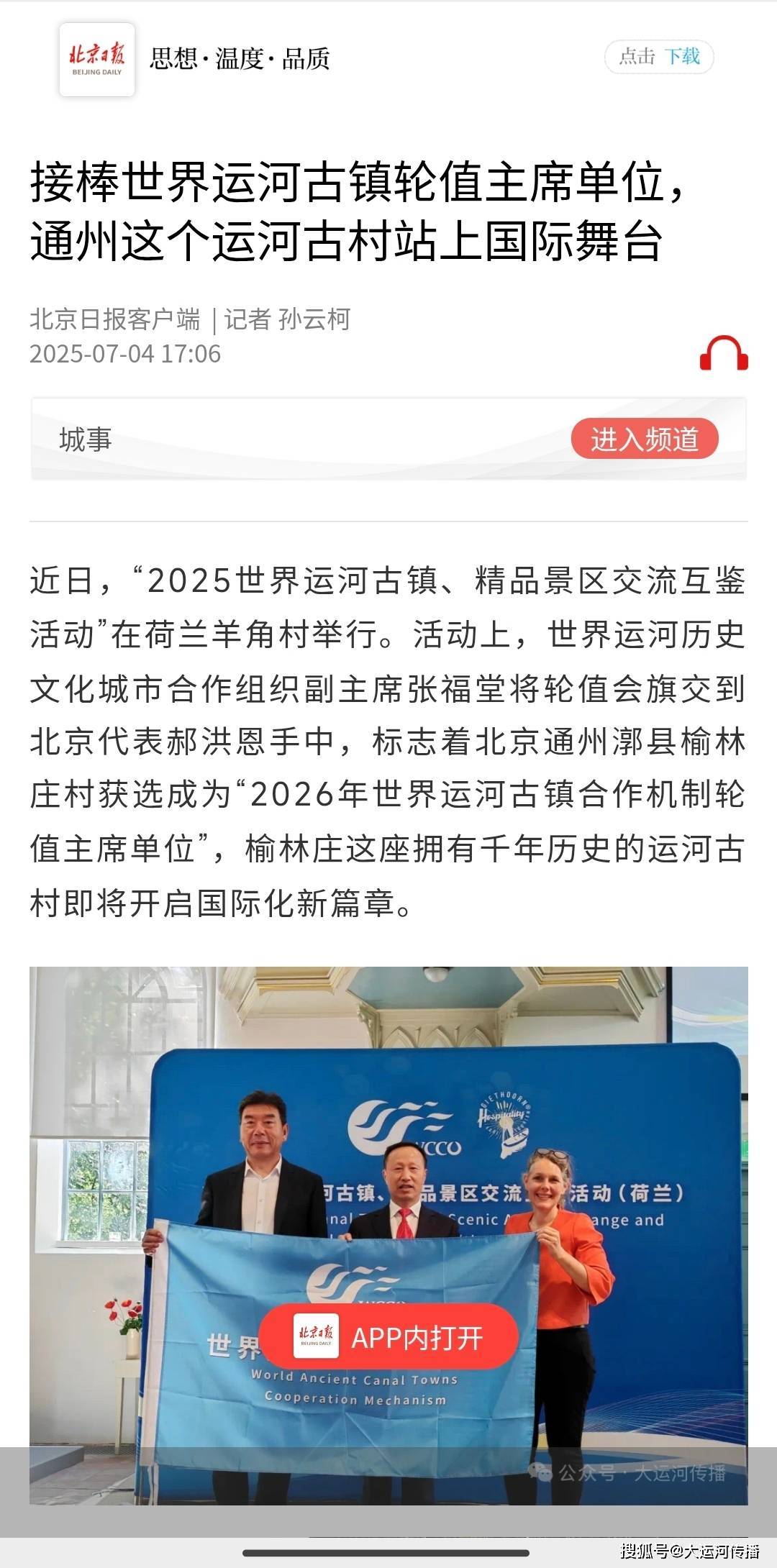 大会推选出新一届2026年世界运河古镇合作机制轮值主席单位北京通州漷县镇榆林庄,榆林庄将承办2026 年世界运河古镇会议。