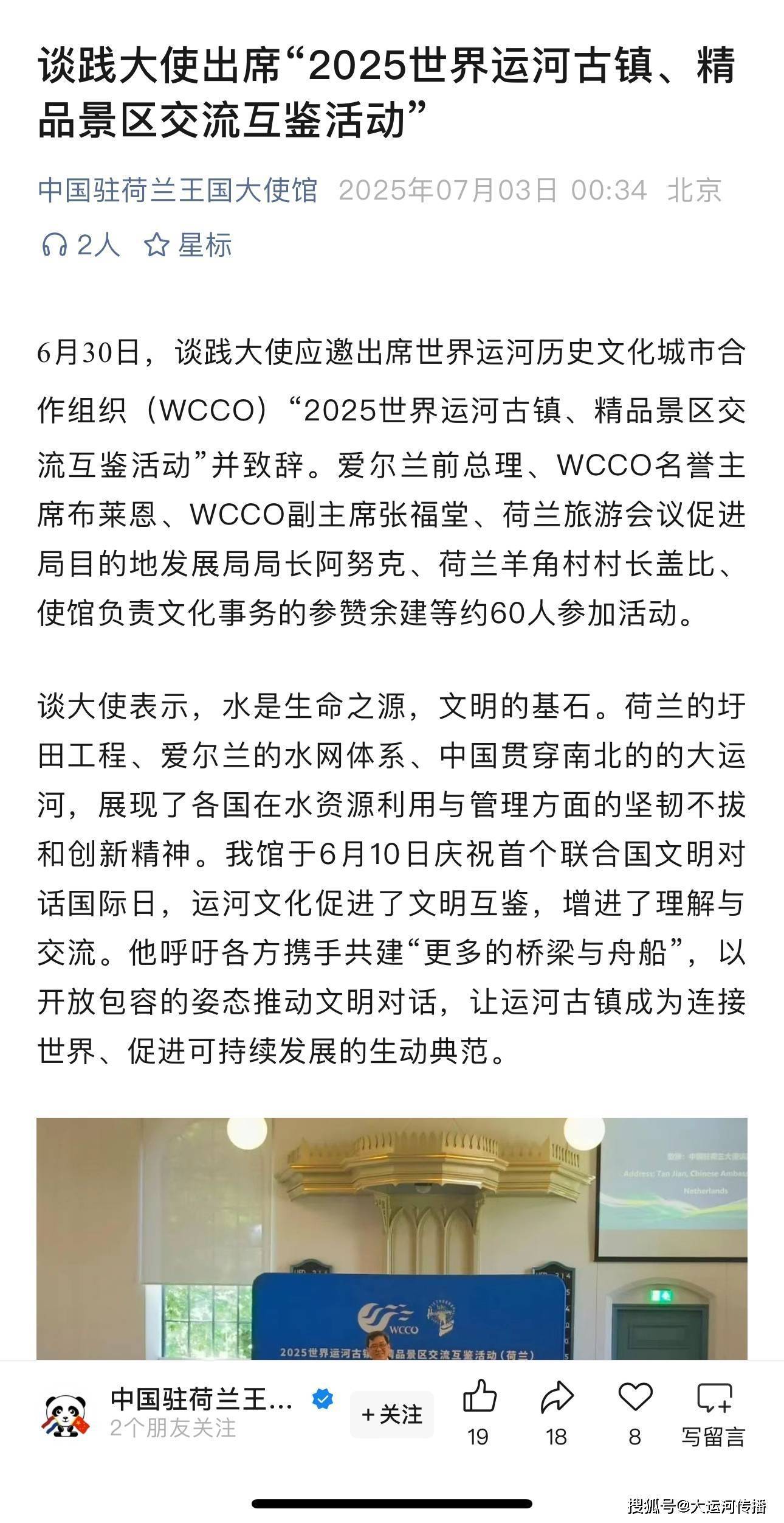 聚焦荷兰运河主题交流②|2025世界运河古镇、精品景区交流互鉴活动在荷兰举行 谈践大使与会致辞“民心相亲远比军事同盟重要”