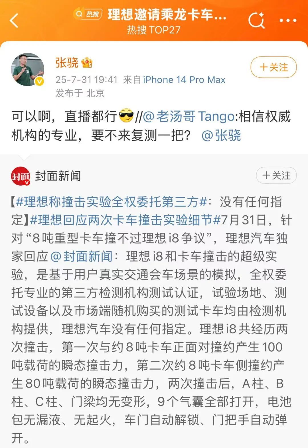 7月31日,理想汽车产品负责人@老汤哥Tango回应理想i8和卡车对撞事件:“相信权威机构的专业,要不来复测一把? 理想汽车产品线负责@张骁 ”随后,张骁回应:“可以啊,直播都行。”