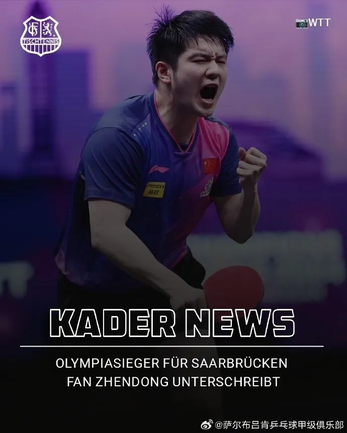 2025年6月1日,德甲萨尔布吕肯俱乐部通过社交媒体宣布中国运动员樊振东加盟该俱乐部,征战2025-2026赛季德国乒乓球甲级联赛和欧洲冠军联赛。