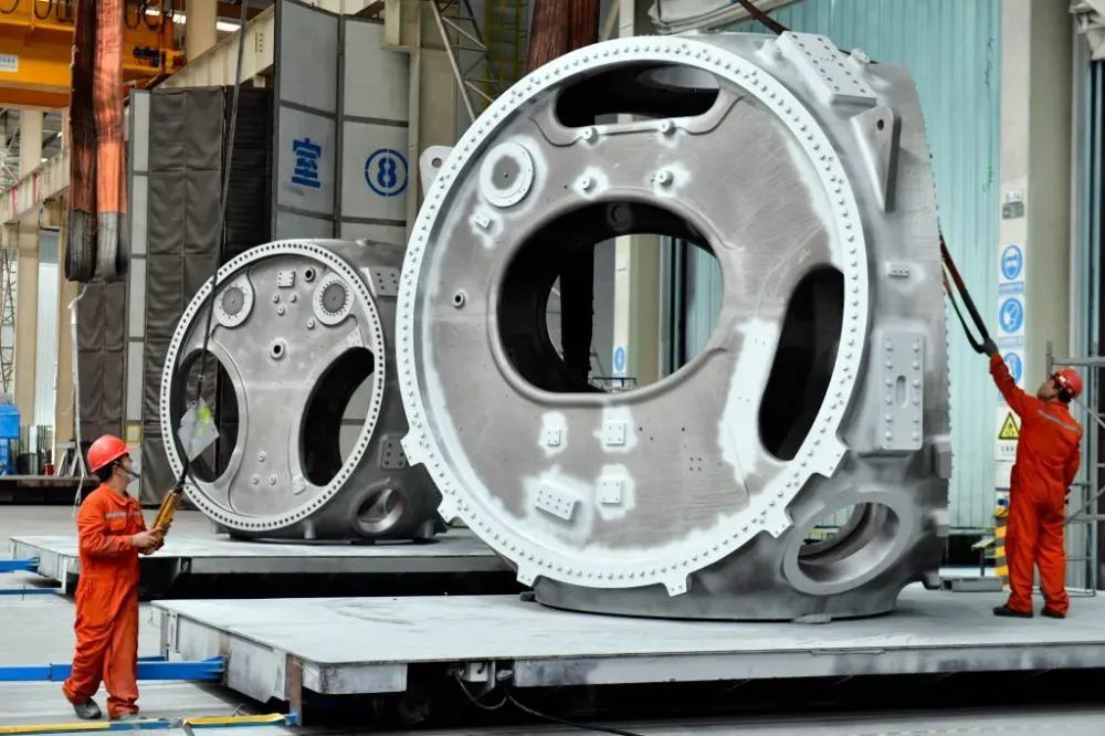 在位于山东省滨州市惠民县的山东国创精密机械有限公司,工作人员在对风电轮毂进行喷涂作业。摄影:新华社记者郭绪雷