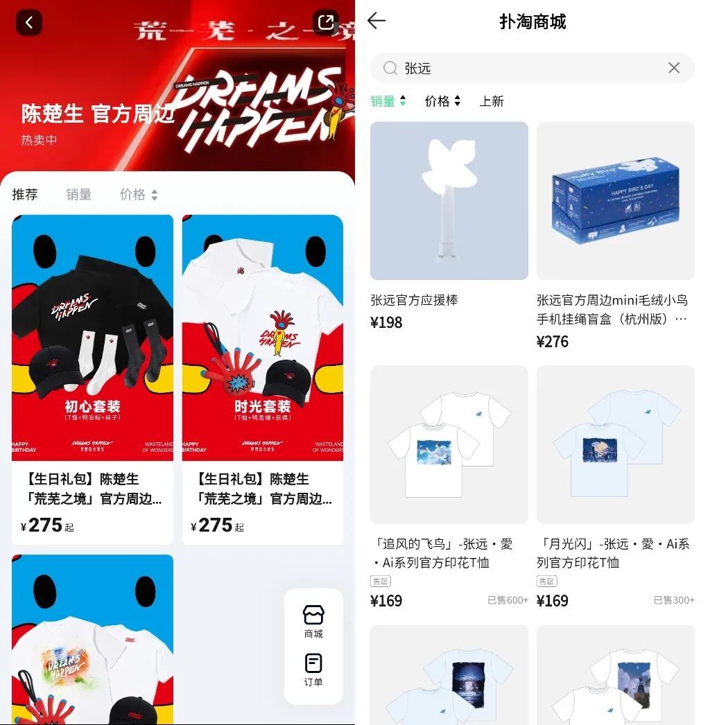另外一些明星尚未建立自己完整的运营团队,而维护APP、小程序的成本比较高,还是会选择与平台合作。比如,陈楚生的“六毛”就是在大麦商城,张远的“呆呆鸟”是在QQ音乐扑淘商城。