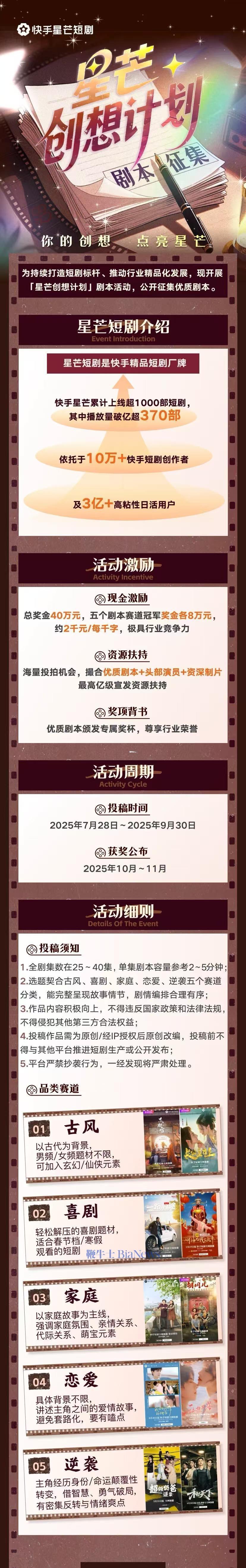 这项计划分为“快手磁力引擎短剧单元”和“快手星芒短剧单元”,面向短剧制作团队和剧本创作方公开招募。