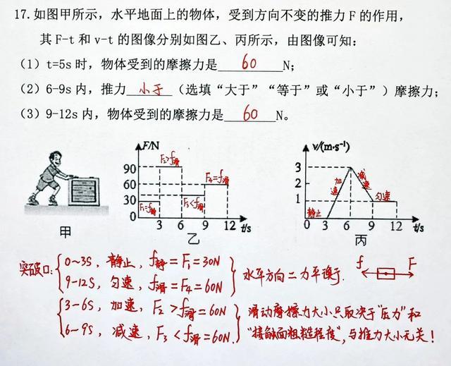 锁定匀速段(9-12秒): 匀速运动时物体受力平衡。推力F₄=60N,此时滑动摩擦力 = 推力 = 60N。