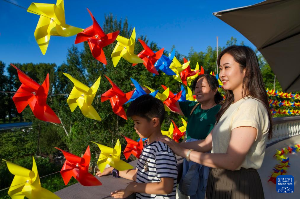 8月1日,住宿游客在嘉荫县朝阳镇新发村江景石苑民宿观景平台上欣赏风光。