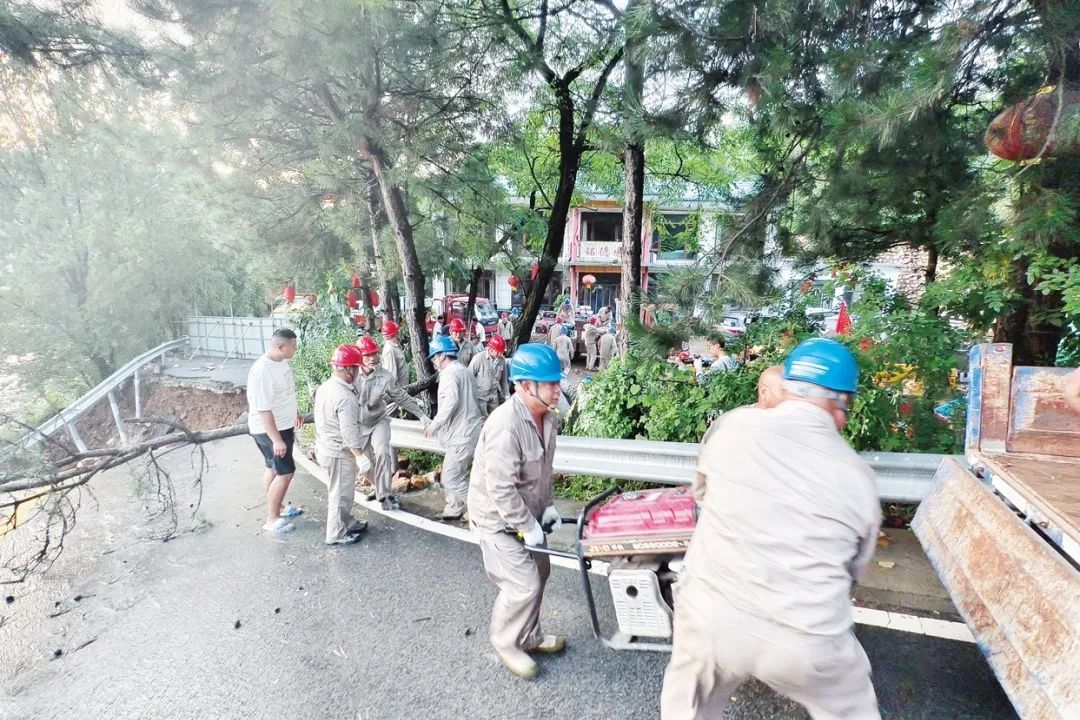 图一:7月29日,国网北京平谷供电公司工作人员在金海湖镇将军关路抢修受损电力设施。刘小军/摄